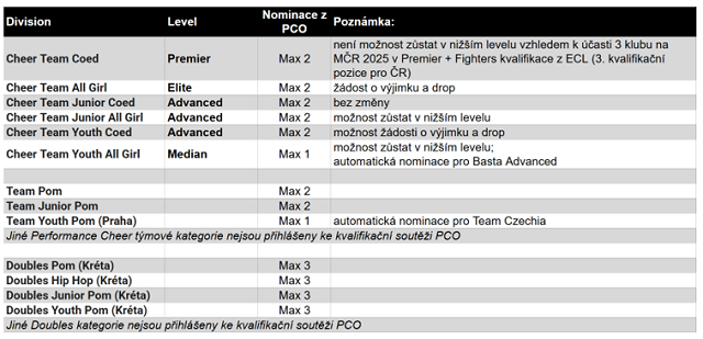 Prezidium ČACH zároveň konstatuje, že informace o této změně byla národním svazům doručena v krátkém časovém horizontu před konáním kvalifikační soutěže Prague Cheer & Dance Open 2026 (PCO), která se uskuteční dne 28. - 29. 3. 2026.